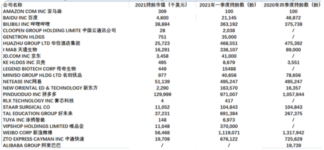 13F文件显示,一季度高毅资产分别买入了 亚马逊、百度、哔哩哔哩、中国云通讯、京东、拼多多、网易、新浪微博、涂鸦智能、唯品会、贝克找房、传奇生物 等科技股,略微减持了拼多多和新浪微博,大幅减持百度,而网易则持仓股数不变。