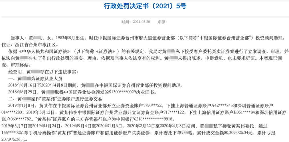 近日,浙江证监局公布的一则行政处罚决定书显示,时任中银国际证券台州营业部投资顾问助理黄某燕,私下接受客户委托买卖证券,亏损20万,同时,黄某还被罚11万。
