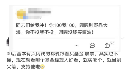 甚至还有人说,“冲呀,就当给小姐姐刷了火箭”,把买基金这种投资行为看作了直播打赏。