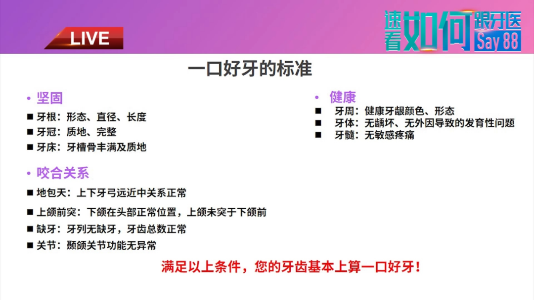 牙齿健康的标准 1978年国际初级保健大会发表了著名的《阿拉木图宣言》指出,健康不仅仅是没有疾病和衰弱,而是身心健康、社会幸福的完满状态。牙齿健康是整体健康的组成部分,关系到身心的幸福感。苏杭在直播中介绍到,1981年世界卫生组织(WHO)制定的牙齿健康标准是牙齿清洁、无龋洞、无疼痛感、牙龈颜色正常、无出血现象。具体来说就是牙根、牙冠、牙床坚固,牙周、牙体、牙髓健康,没有地包天、上颌前突、缺牙、颞颌关节功异常等情况,满足以上条件,可以说是拥有了一口好牙。