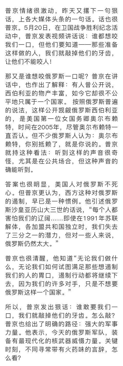 第一,普京相当清醒。清醒俄罗斯除非四分五裂,否则,不管怎么变,西方都不会善罢甘休,都希望一口一口吃掉,甚至瓜分西伯利亚。沙俄时期是这样,苏联时期是这样,现在还是这样。所以,北约已经到家门口,刚刚北极圈会议,美俄外长更唇枪舌剑,所以,俄罗斯不能退,只能斗,让对方不敢侵犯。