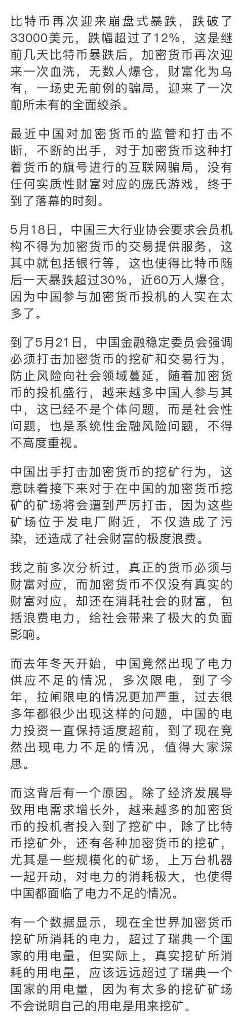 如果不用辛苦劳动,不用去创造财富,就靠写代码发明加密货币,然后让人去交易、去炒作,就能实现财富自由,那这个世界就彻底大乱了,也是对劳动者的嘲笑。这一次中国对加密货币的全面围剿,是菩萨心肠,雷霆手段,是对投机者的挽救,是为了避免无数人最终破产,这也是捍卫货币发行权的重要一战,只能成功,不能失败!
