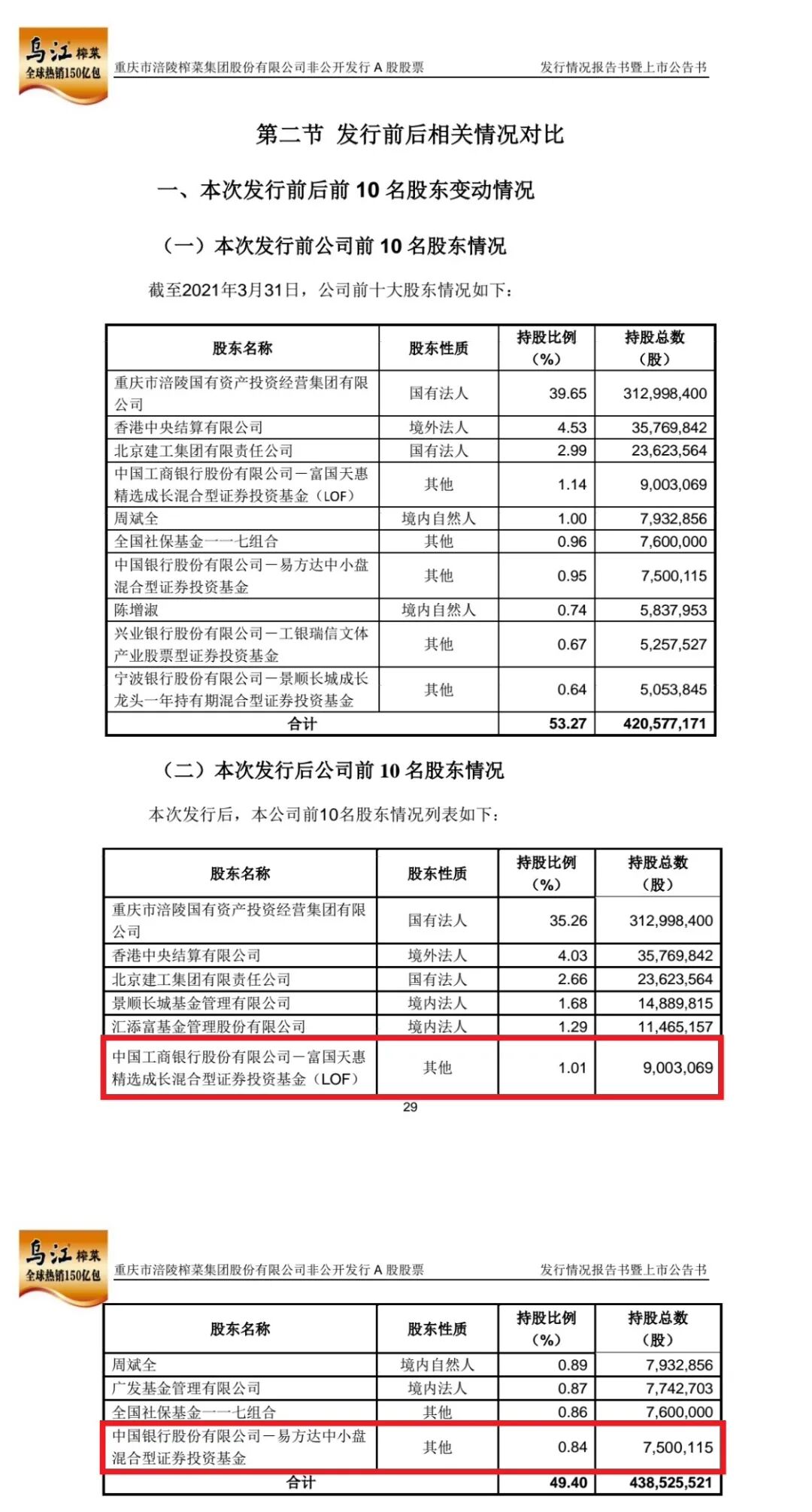 公告显示,截至2021年4月20日止,涪陵榨菜实际完成了人民币普通股(A股) 98,272,781股的非公开发行,本次非公开发行股票发行价格为33.58元/股。本次非公开发行股票的定价基准日为发行期首日(2021年4月12 日),发行价格为不低于定价基准日前20个交易日股票交易均价的80%,即33.25元/股。