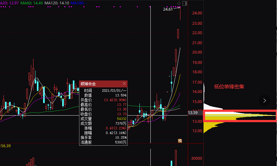 当低价位区域出现单峰密集形态时,往往是主力在充当买家的角色,散户在充当卖家的角色。如果此时股民朋友介入这类个股中,就能够在主力筹码集中度较高的时候杀人场中,主力拉升股价时,股民朋友就能坐享其成。