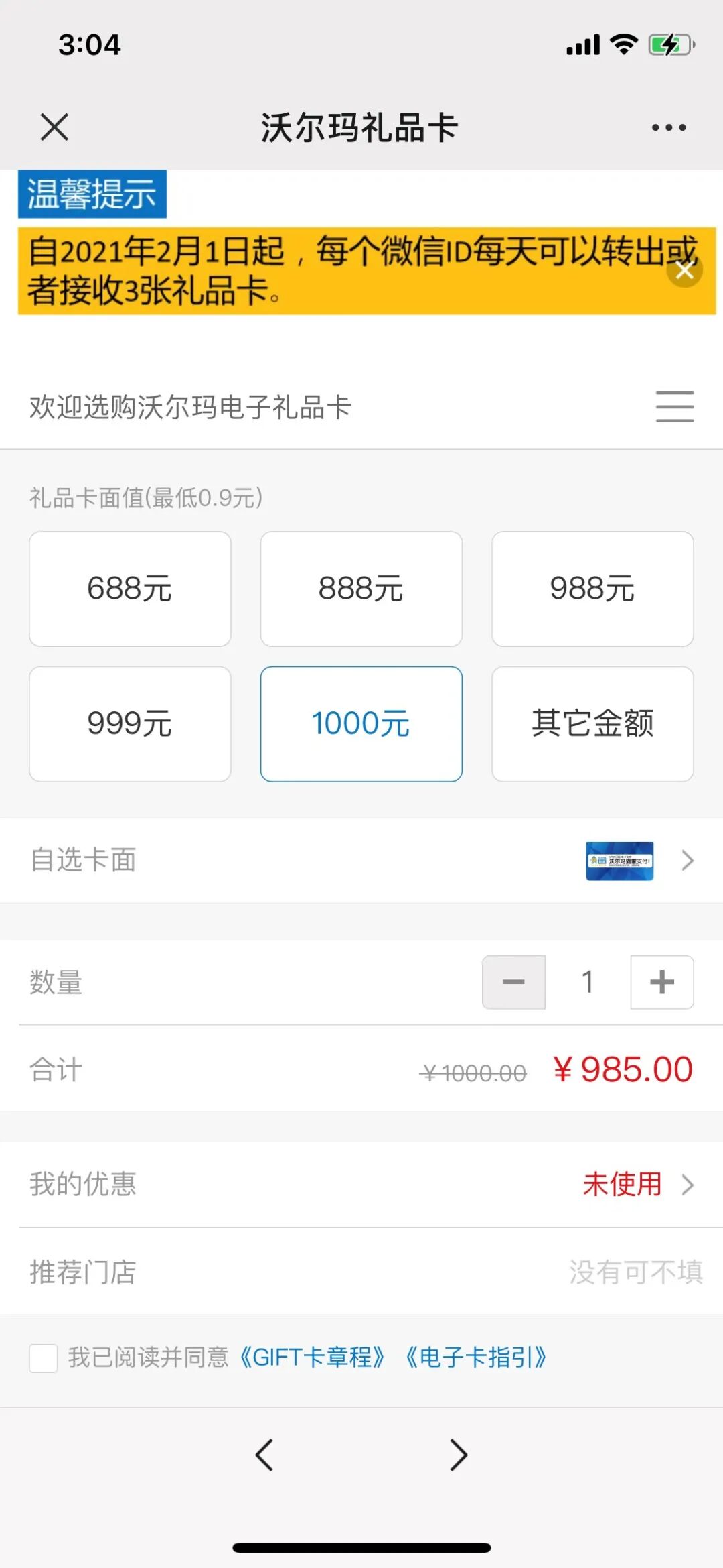 问题在于,易点公司销售的沃尔玛电子礼品卡,为什么会提前一天充值?易点公司售卖的礼品卡的发售渠道来自哪里?“券小福”旗舰店客服回复称,“我们销售的礼品卡采购来自沃尔玛官方。卡券在下单之后绑定使用说明卡券无质量问题;本店销售的是官方卡密,整个发货环节是全自动发货且信息隐藏的,卡券发货完成后只有下单账号和收货手机号才能接收查看卡券信息。”时间财经致电沃尔玛官方客服表示,沃尔玛电子礼品卡官方购买渠道包括京东官方旗舰店和线下门店,如果想购买带有卡号、卡密的沃尔玛电子礼品卡,需要联系沃尔玛线下门店。根据沃尔玛官方说法,如果带卡号卡密的电子卡只能通过线下店获取实体卡,通过刮卡的方式获取密码。那么,在采购后与发货前的时间里,由谁来保管易点公司的礼品卡卡号卡密?“券小福”旗舰店客服未对此作出回复,只表示:“相关的资质证件都有提供给平台,有疑问可以咨询平台。” 0优惠热销? 令人不解的还有,“券小福”旗舰店礼品卡售价明明没有任何优惠,销售却很“火爆”。在“券小福”旗舰店,面值1000元的沃尔玛超市礼品卡售价也是1000元,而同类面值的电礼品卡在沃尔玛官方微信公众号进行购买的售价为985元。 截图来自“券小福”旗舰店