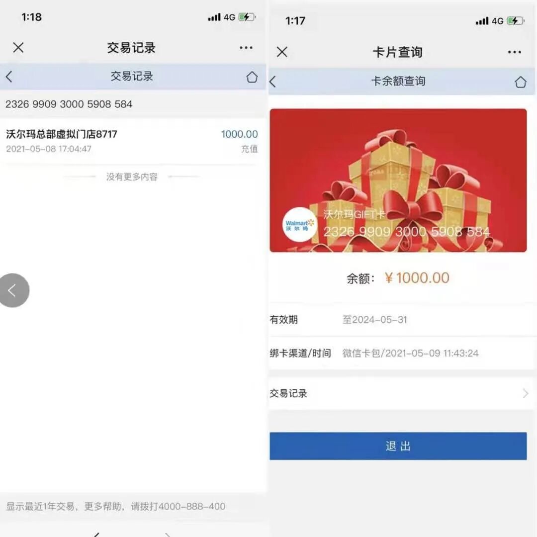 怎样才能拿到赔偿款呢?对方在电话里指挥刘女士操作手机。结果,赔偿款没收到,刘女士的建设银行卡反被划走了1万元。收到银行转账短信提醒,这时的刘女士才清醒过来遭遇了“电信诈骗”。经查发现,该笔交易通过某电商平台名称为“券小福”旗舰店购买了十张面值1000元的沃尔玛电子礼品卡,同时该卡账号和密码均被他人绑定无法使用。当刘女士向电商平台、“券小福”旗舰店和沃尔玛公司反映相关情况,三方均表示:“请报警。”目前,该案件已被警方刑事立案。“券小福”旗舰店主要经营沃尔玛、家乐福、肯德基、星巴克礼卡等虚拟充值类商品,商户主体是易点生活电子商务有限公司(简称“易点公司”)。官网介绍显示,易点公司成立于2014年,注册资金5000万元。在福建、北京、上海等省市设有分支机构,业务遍及全国三十多个省份。 礼品卡采购来源 时间财经通过沃尔玛官方交易查询系统获悉,易点公司售卖给刘女士的沃尔玛电子礼品卡充值时间均在5月8日下午5点左右,被微信卡包绑定时间为5月9日上午11:42:33至11:45:27。这也就是说,在支付订单后不到三分钟的时间里,刘女士的礼品卡全部被他人绑定。而时间财经通过沃尔玛微信公众号购买礼品卡发现,其购卡/充值时间与支付时间完全一致,且没有支付密码。而时间财经通过沃尔玛微信公众号购买1元面值礼品卡后发现,其购卡/充值时间与支付时间完全一致,且没有卡密。