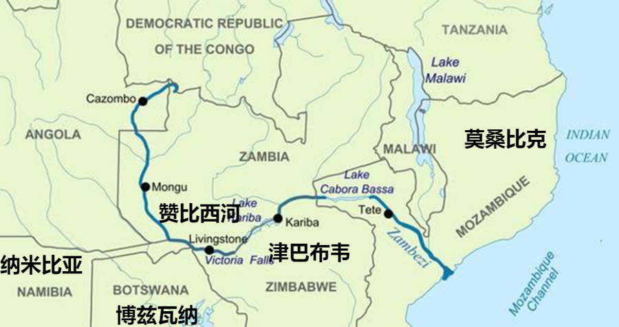 为何这条狭长的卡普里维地带能够连通东非和西南非洲?原因就在于这条从西南非洲伸出来的“斧头”地区刚好搭上了非洲南部第一大河——赞比西河,该河自西向东,以S型蜿蜒汇入印度洋。