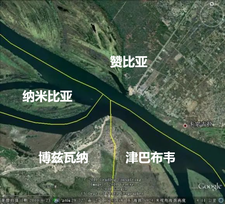 顺便一提,四国交界处的其他三国领土,实际上也与英国殖民统治脱不开干系。津巴布韦、赞比亚两国独立前曾分别是英国“南北罗德西亚”殖民地,独立后维持了原殖民地疆界;而博茨瓦纳独立前为英国的“贝专纳保护地”,从地图上不难看出,卡普里维地区就是从“贝专纳保护地”割出来的。