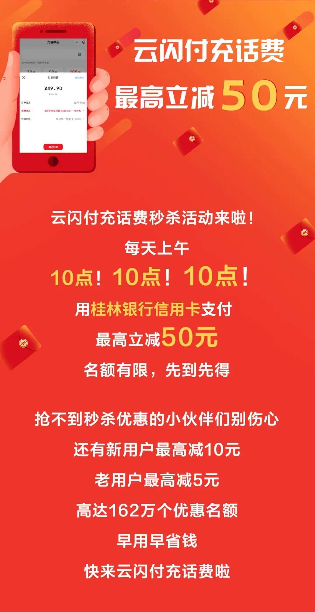 信用卡充话费秒杀,最高减50元 每天上午 10点 ,用 桂林银行信用卡 充手机话费有机会享免单,最高减 50元 。