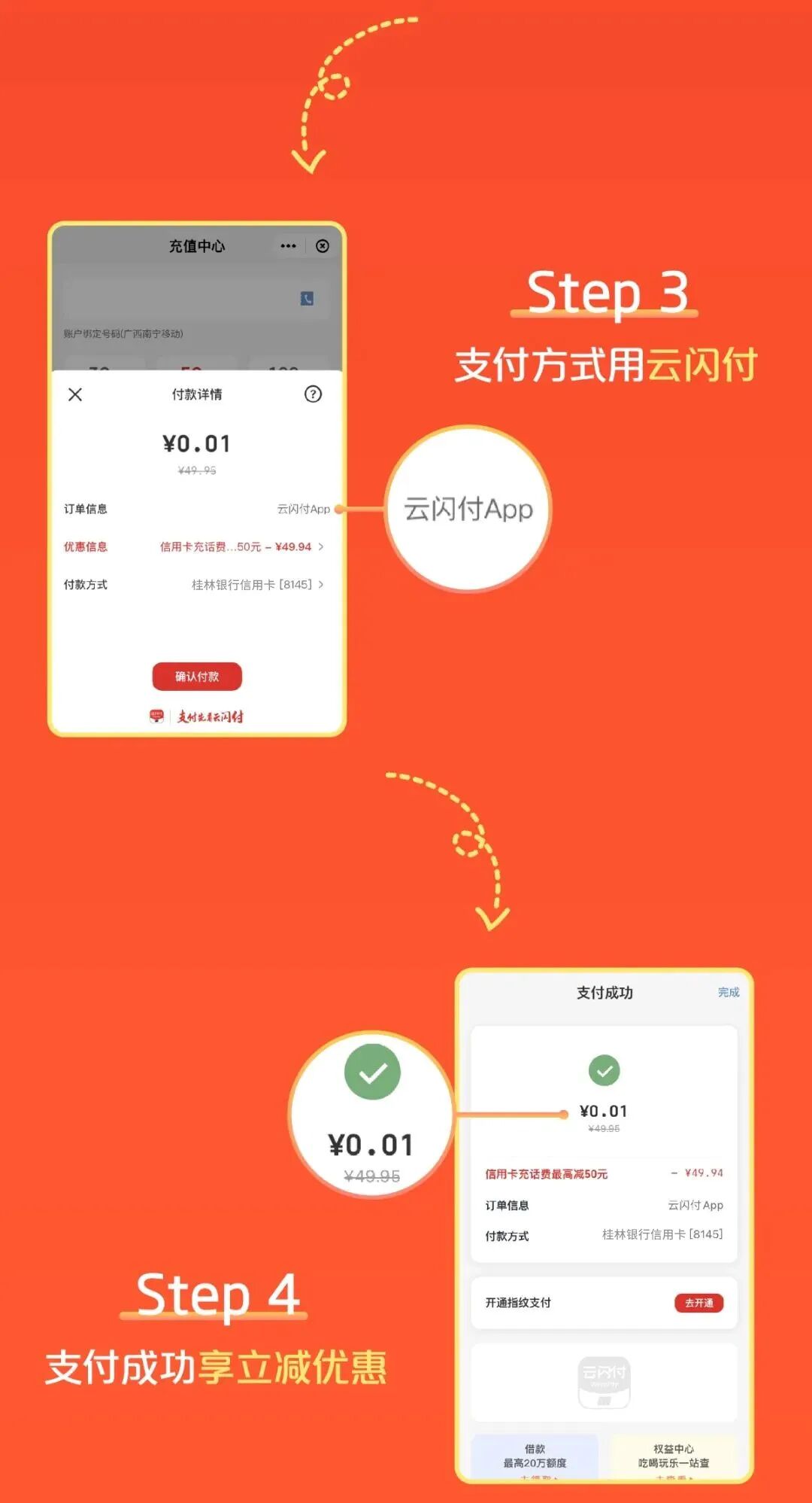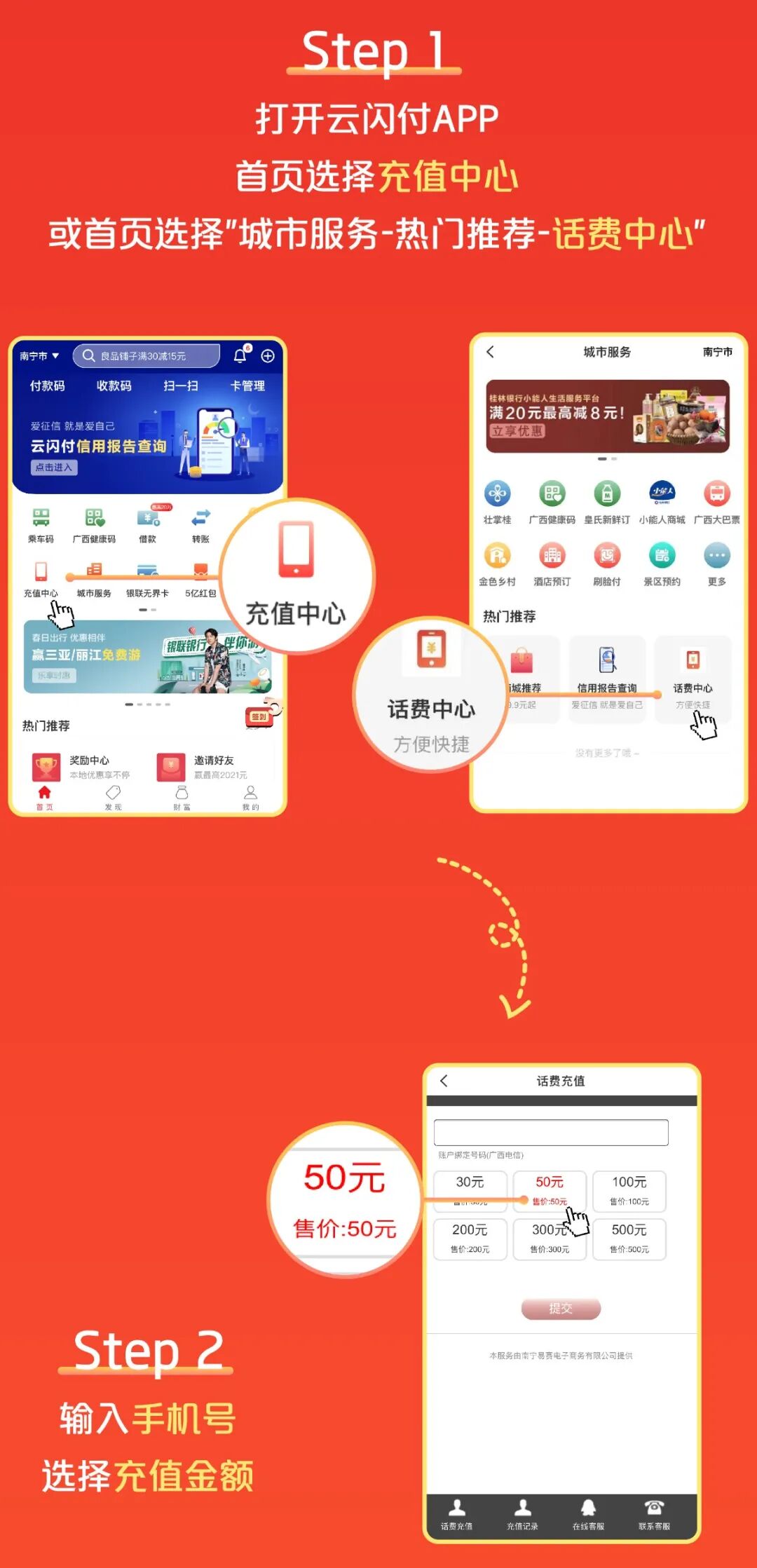 注:同一云闪付APP用户每月限享1次优惠,秒杀免单、新用户、老用户这三个活动不可同时参与,活动期间只能享受1次新用户活动。用户在云闪付APP首页选择"城市服务-热门推荐-话费中心",或者首页选择“充值中心”,输入充值手机号码,通过"云闪付"支付,确认付款完成交易。活动总名额162万名,名额有限,先到先得。