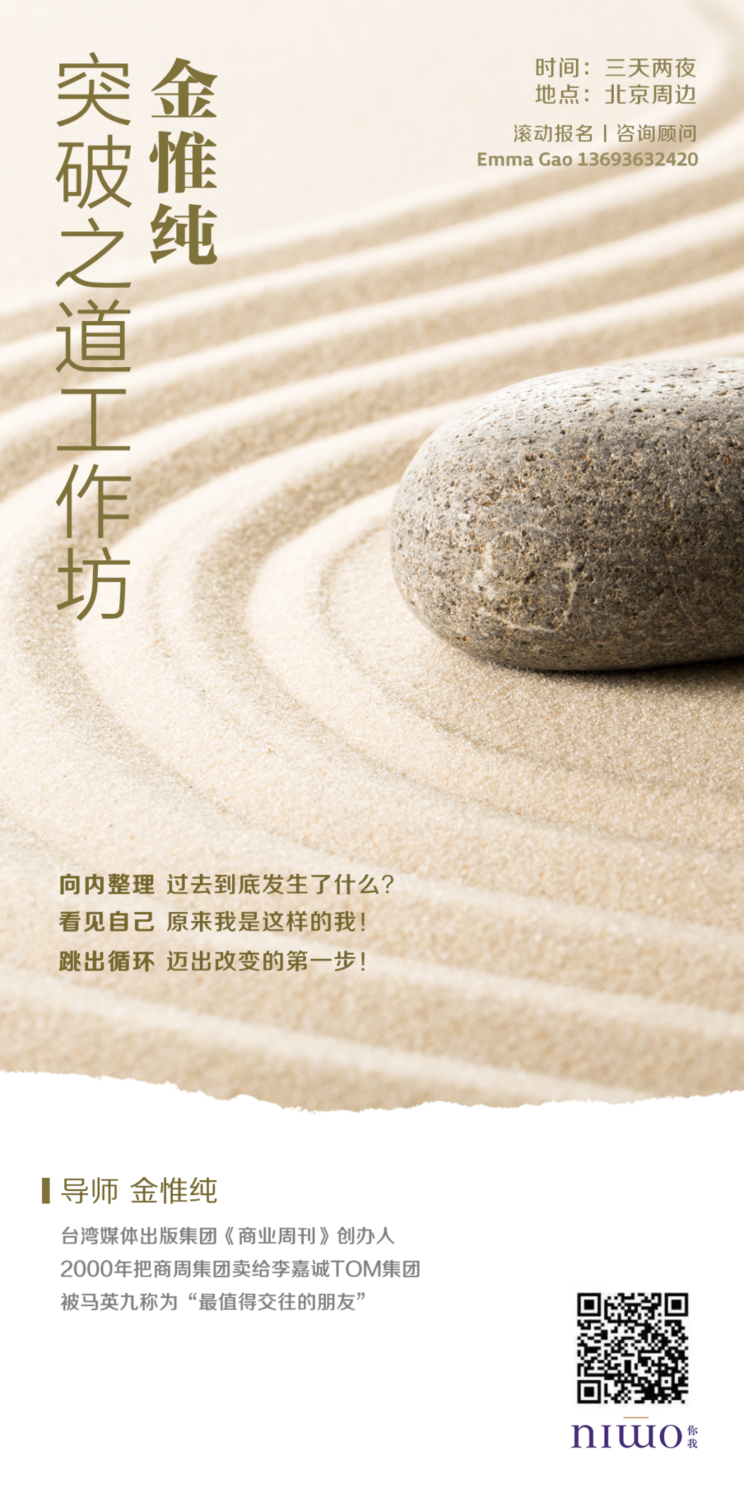 他在工作坊中看见自己一生最快乐的时光,是童年和祖母的相处。祖母在乡下被称为“仙姑”,总是无怨无悔地为人付出,而且活得极其自在,让人如沐春风。 他发现,正是因为内心深处希望活得和祖母一样,因此常不满于自己在工作中的各种“不得不”,但又无法下决心改变,最后陷入了拿不起又放不下的窘境。 他问我该怎么办,我给了他四个字:以假修真! 我们都知道自己还做不到,还不是真的,还差很远,但我们的心还没死,仍然保持向往,还愿意“以假修真”,这样就够了。 我建议他先不忙着转换赛道,因为现在的事做不真切,以后的事也很难成真,他不妨继续做现在正在做的事,同时转换成“事上练心”的态度。在工作中通过为人付出,不断修正自己,也许就能活出祖母那样的生命状态了。在事业上的笃定,对自己人生的满意,都是修炼出来的,而不可能是想出来的。 要把中年危机转化成中年机遇,换工作之前,先换一个新的自己。 “事上练心,以假修真”这八个字,说不定就是良方!