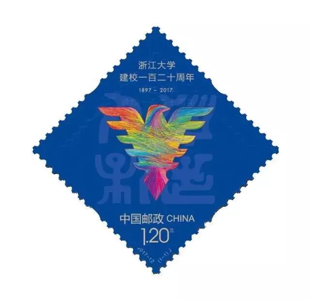 《浙江大学建校一百二十周年》纪念邮票以“浙大蓝”为主色调,主图为浙江大学一百二十周年校庆标识——五月“求是鹰”,底图为浙大校训:“求是创新”篆书字样。
