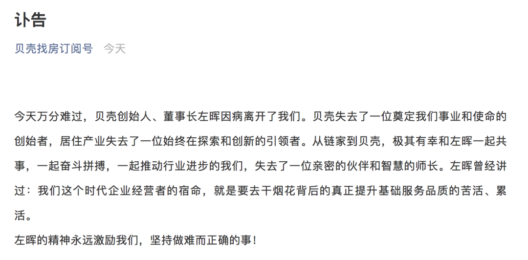 NO.1 贝壳找房 20日发布消息,公司创始人兼董事长 左晖先生因疾病意外恶化于2021年5月20日去世 。公司董事会将就公司治理和相关事宜做出适当安排,并在两周内适时发布公告。