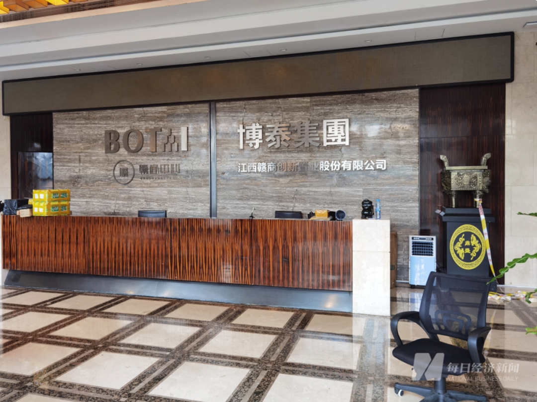在博泰集团一楼外,还挂着“江西省地产协会”“江西地产行业仲裁中心”的牌子。记者走进一楼大厅看到,前台已经没有了工作人员,墙上分别挂着“赣商中心”“博泰集团”“江西赣商创新置业股份有限公司”的牌子。