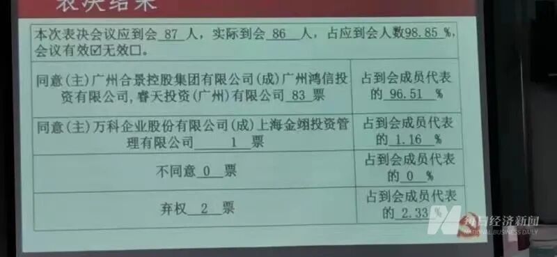 《每日经济新闻》记者独家获取的一份详细表决结果公示显示,该次表决会议应到会87人,实际到会86人,占应到会人数的98.85%。其中,同意合景泰富联合体的为83人,同意万科联合体的1人,弃权的2人。
