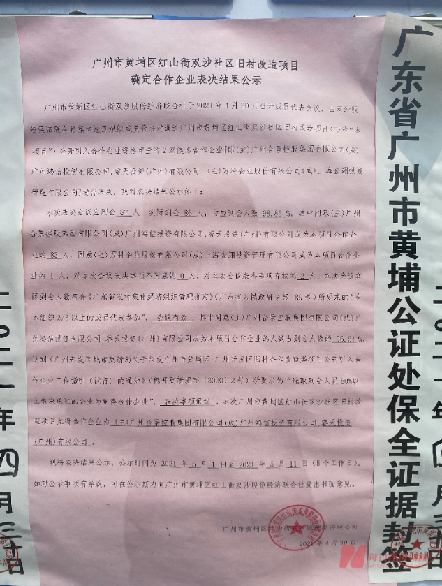 公示指出,本次会议实际到会人数符合《广东省农村集体经济组织管理规定》(广东省人民政府令第189号)所要求的“有本组织2/3以上的成员代表参加”,会议有效;其中同意合景联合体成为本项目合作企业的人数占到会人数的96.51%。