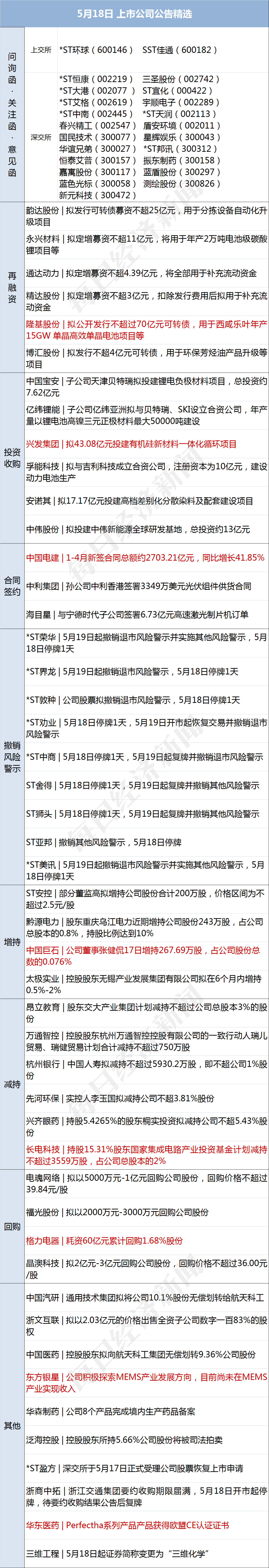 NO.1 5月17日, 京东物流在港交所发布公告,正式启动股份全球公开发售 ,总计6.092亿股,价格区间为每股39.36港元至每股43.36港元。公开发售时间为5月17日至5月21日,股票代码2618,预计将于5月28日上市交易。 NO.2 华为 :17日召开“华为中国生态大会2021”,华为轮值董事长徐直军在发布主题演讲时谈及华为HarmonyOS(鸿蒙系统),徐直军预计,今年底将有至少3亿设备搭载鸿蒙系统,其中2亿台为华为自有设备。 NO.3 中国移动 :中国移动17日晚在港交所公告,为紧抓拓展信息服务的机遇窗口期,推动创世界一流“力量大厦”战略落地,推进数智化转型,构建新型数智生态,激发高质量发展新动能,公司拟申请本次人民币股份发行。于2021年5月17日,董事会批准建议进行人民币股份发行、特别授权及相关事宜。 据披露,中国移动拟公开发行人民币股份数量不超过 9.65亿股 (行使超额配售选择权之前)。 NO.4 民生证券 :针对私募人士叶飞爆料多家券商参与中源家居市值管理一事, 民生证券方回复称:民生资管并未参与中源家居市值管理, 今年一季度确实有自营部门的投资经理在投资权限内买入中源家居股票,但公司肯定不会参与上市公司市值管理。 NO.5 城地香江 :公司否认委托任何盘方购买公司股票,开展所谓“市值管理”,公司实际控制人、公司董事、监事、高级管理人员也未与恒泰证券资管经理管宣及微博大V“叶飞私募冠军直说” 有过任何接触。 NO.6 苹果: 苹果周一宣布,随着支持Dolby Atmos的Spatial Audio的加入,苹果音乐(Apple Music)将为用户带来更高级别的音质。空间音频让艺术家有机会通过真正的多维声音和清晰度为他们的粉丝创造沉浸式音频体验。Apple Music用户还将能够以无损音频收听超过7500万首歌曲,这些新功能将从下个月开始为苹果音乐用户提供,用户无需额外付费。 NO.7 ST舍得 :由于原间接控股股东非经营性占用公司资金问题已解决,上交所于5月17日同意撤销对ST舍得股票实施的其他风险警示。公司股票将于2021年5月18日停牌1天,2021年5月19日起复牌并撤销其他风险警示。撤销其他风险警示后,公司股票简称由“ST舍得”变更为“舍得酒业”,股票价格的日涨跌幅限制由5%变更为10%。 NO.8 长电科技 :公司持股15.31%股东国家集成电路产业投资基金股份有限公司计划自2021年5月18日起15个交易日后的180日内,计划以集中竞价交易方式减持不超过3559万股,占公司总股本的2%。 NO.9 知乎 :知乎17日公布截至2021年3月31日的第一季度未经审计的财务报告,公司当季实现营收4.78亿元,同比增长154.2%;毛利约2.73亿元,同比增长248.5%;毛利率从去年同期的41.6%提高至57%。这是知乎3月26日登陆纽交所后的首份财报。 NO.10 Gojek :据路透社,印尼网约车、支付公司Gojek和电商巨头Tokopedia周一同意合并,双方创建一家价值数十亿美元的科技公司GoTo,为印尼有史以来最大规模的合并。合并后的GoTo将涵盖东南亚最大经济体的网购、快递服务、网约车、外卖和其他服务,将成为东南亚最大的私营科技公司。