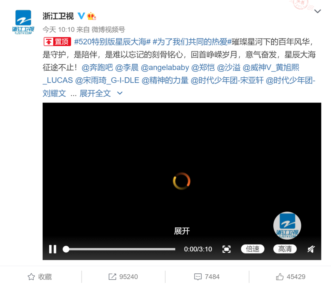 浙江卫视在5·20当天推出了一个特别节目“520特别版星辰大海”MV,在该MV中,共计18位明星艺人参与了演唱,除了综艺节目“奔跑吧兄弟”的几位常驻嘉宾外,还有时代少年团的四位成员,吴奇隆窦骁等艺人。