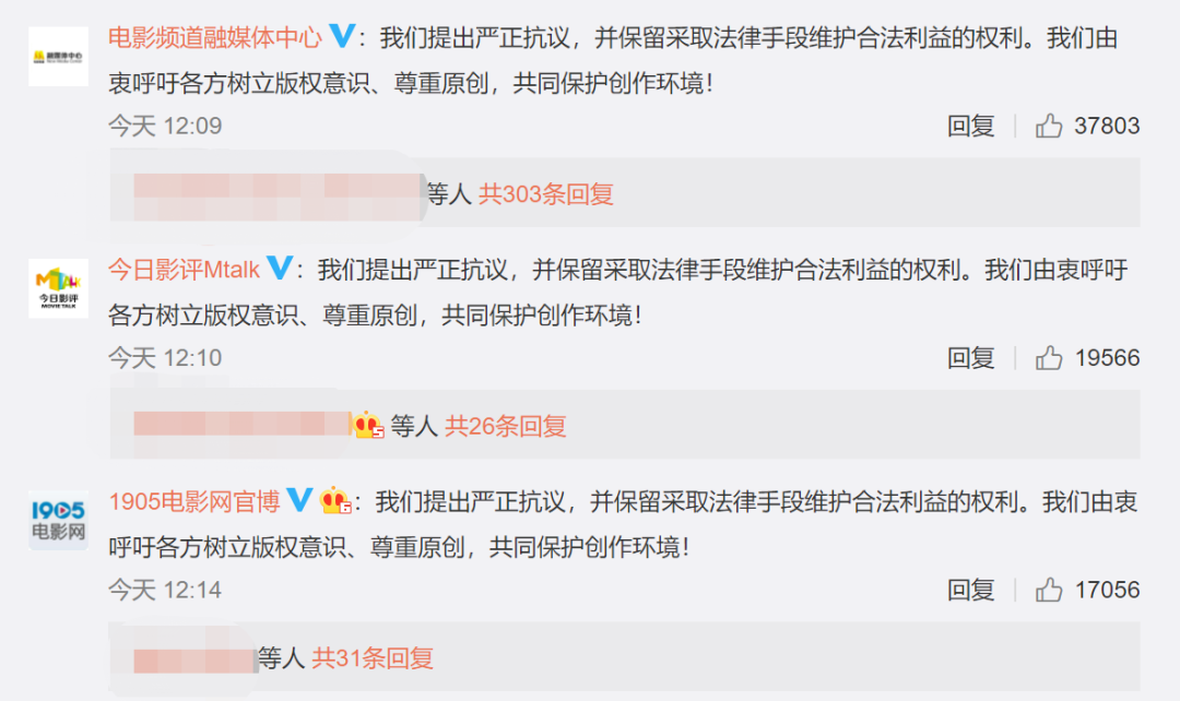 评论中,电影频道融媒体中心、1905电影网等强调,“我们提出严正抗议,并保留采取法律手段维护合法利益的权利。我们由衷呼吁各方树立版权意识、尊重原创,共同保护创作环境!”