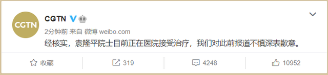 此前曾发布袁隆平去世消息的CGTN微博也道歉,据@CGTN 微博5月22日消息,经核实,袁隆平院士目前正在医院接受治疗,我们对此前报道不慎深表歉意。