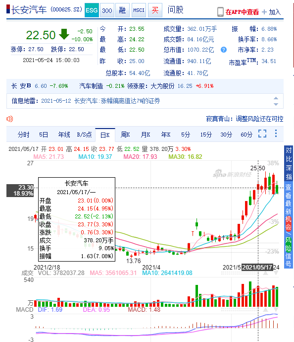 5月24日开盘,在上一个交易日股价涨幅达到8.46%的长安汽车,股价迅速回落,截至当日收盘,长安汽车跌停,报22.5元/股。