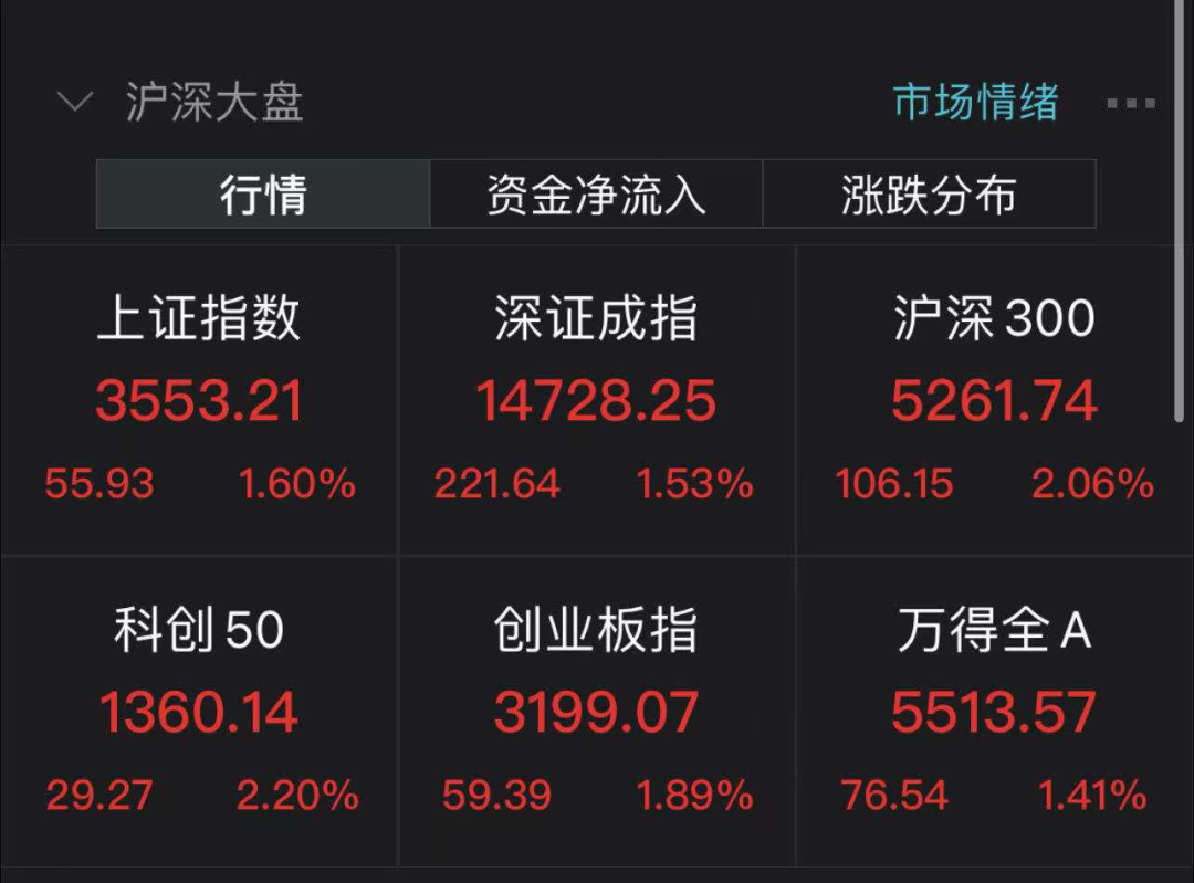 在大金融带领下两市再度低开高走,各指数全面大涨, 沪指一举突破3500,一度创下近三个月新高。 截至午间收盘,上证指数上涨1.6%,报3553点;深证成指涨1.53%,报14728点;创业板指数涨1.89%,报3199点。