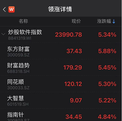 今日上午,Wind炒股软件指数大涨5.34%,板块中个股全线上涨。来源:Wind