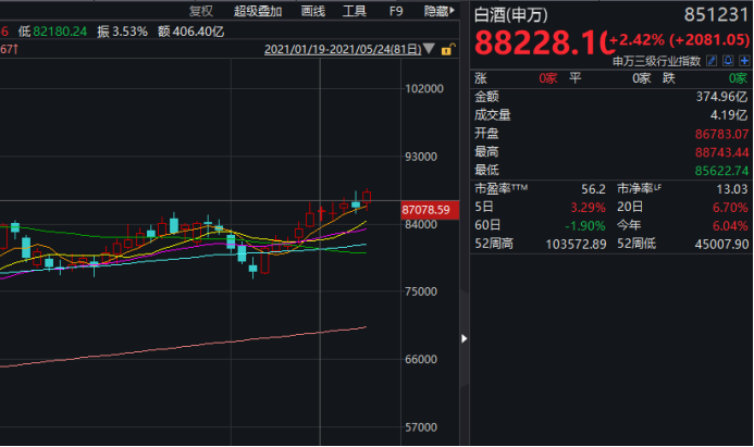 酿酒板块市值最高的 贵州茅台 上午也大幅上涨,该股盘中涨幅超过4%,创出最近两个多月新高。