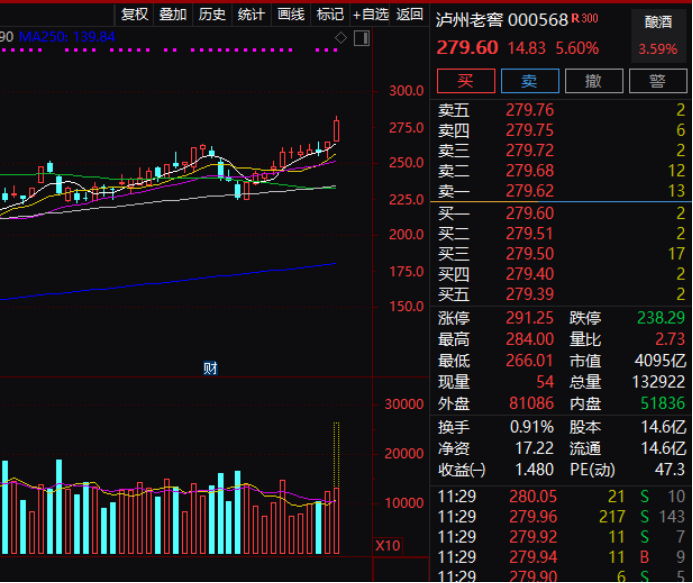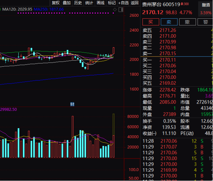 今天(25日)早盘,大金融板块持续拉高,券商、保险、银行等板块全线飘红。券商股延续昨日涨势,开盘走强,板块涨幅4%,湘财股份、哈投股份涨停,中信建投涨8.45%,华创阳安涨6.57%,中金公司涨6.36%,东方财富涨近6%,成交额超90亿元。银行保险也蠢蠢欲动、涨得欢快,厦门银行盘中涨停。茅台为首的茅族股不甘示弱,茅台暴涨近5%,市值暴拉超千亿。