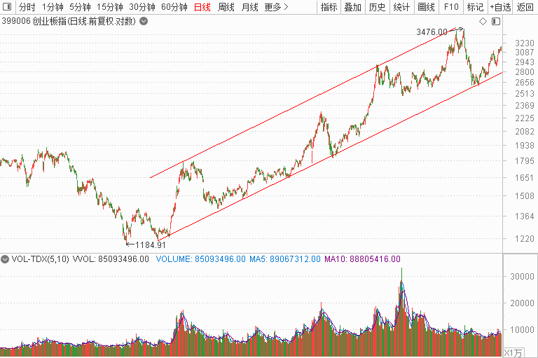 从创业板指的走势来看,位于上升通道内运行,这表明上升趋势良好。