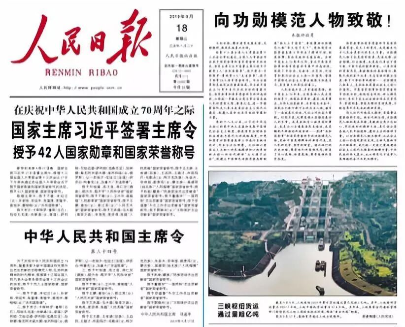 《人民日报》头版头条(2019年09月18日 01版)曾刊发新华社报道全文,并发表评论文章《向功勋模范人物致敬!》