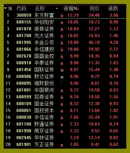 3、注意到券商指数大涨7%,东财大涨超12%,浙商证券、光大证券、国联证券等10余股涨停。保险、银行等金融股也大多发力上扬。