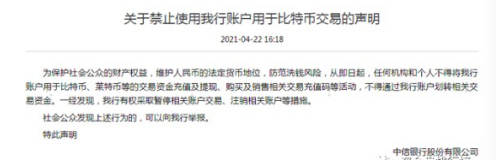 4月22日,中信银行发布了关于数字货币交易的公告:为保护社会公众的财产权益,维护人民币的法定货币地位,防范洗钱风险,从即日起,任何机构和个人不得将该行账户用于比特币、莱特币等的交易资金充值及提现、购买及销售相关交易充值码等活动,不得通过我行账户划转相关交易资金。一经发现,该行有权采取暂停相关账户交易、注销相关账户等措施。由上述中信银行采取的相关做法可以明确看出中信银行并不支持加密货币在国内市场上发展,并且已经颁布禁令对其进行打压。