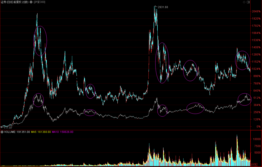 从下图的券商板块与沪深300的指数叠加图可以看到。每次指数有行情时,一定脱离不了券商板块的启动。但是,我们同样也发现,每次券商板块未创新高之时,那么指数调整的时间就会渐行渐近(红色圈)。