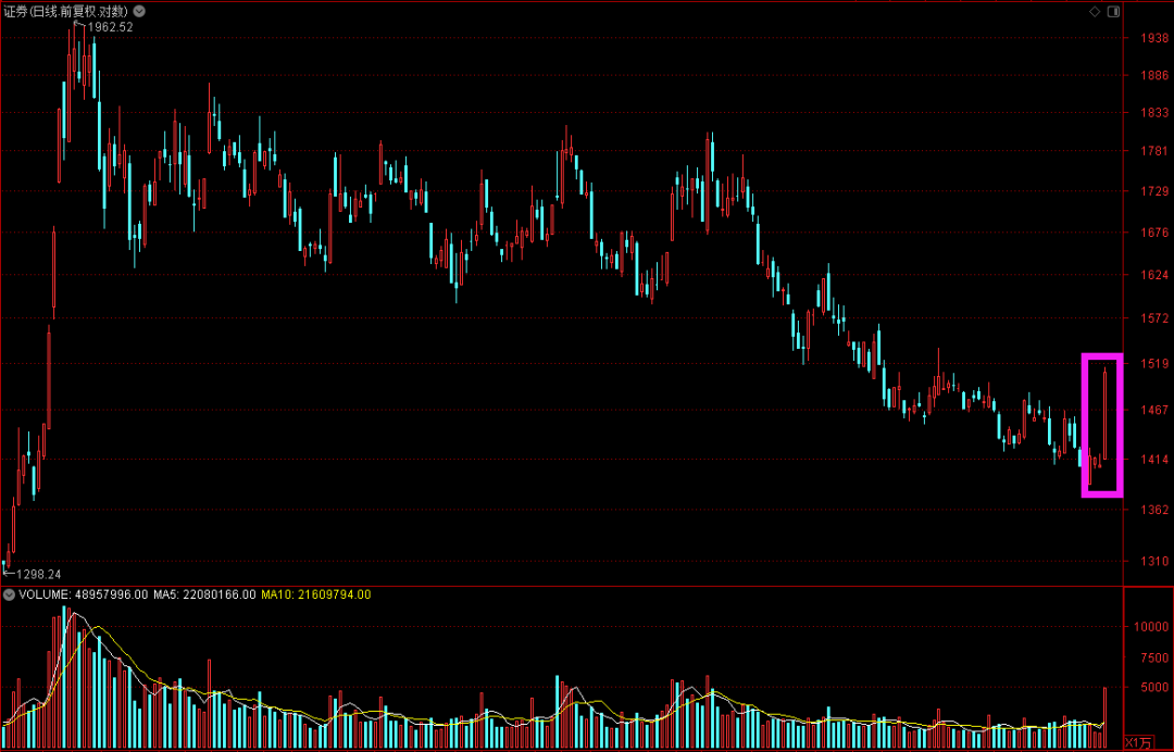 而周五券商板块一骑绝尘率先打响反攻号角,全天强势反攻,使得板块指数单日上涨达到了7.19%,板块成交额突破640亿元。那么这是不是预示着券商板块行情已到?