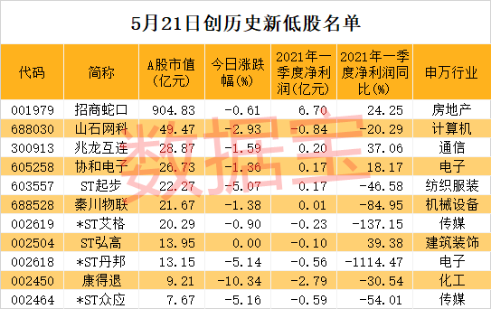 数据宝统计显示,不含今年上市的次新股,今日盘中股价创下历史新低的股票共有11只,如ST起步、*ST众应、*ST丹邦、ST弘高、*ST艾格等ST股票,以及非ST股票的招商蛇口、山石网科、兆龙互连、协和电子、秦川物联等。