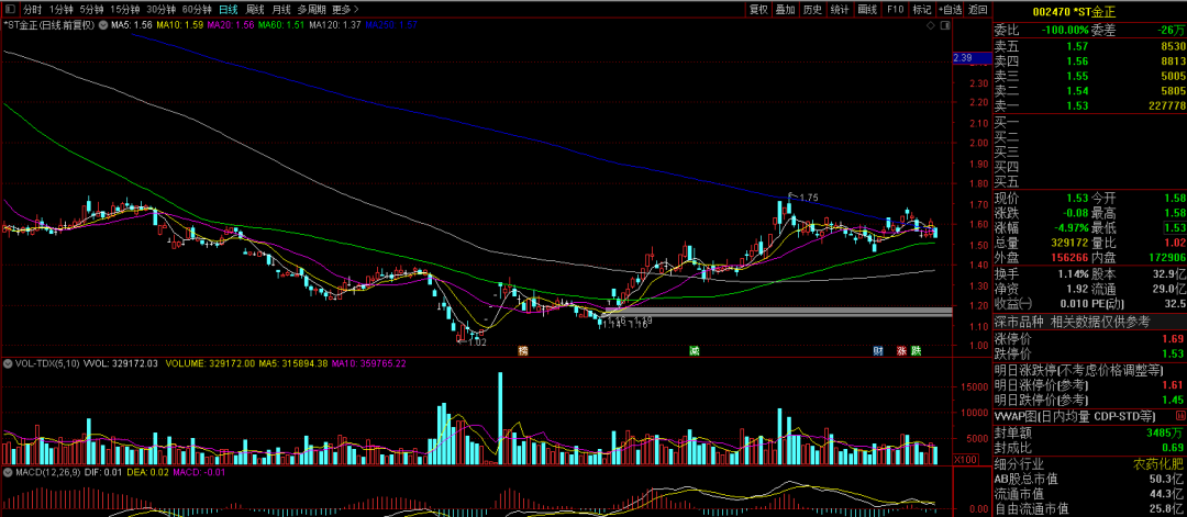 今早,*ST金正开盘没多久就跌停,截至收盘,*ST金正依旧封跌停,报1.53元/股,封单22.8万手。
