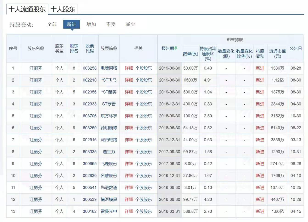 值得一提的是,是A股市场的不折不扣的一名“牛散”。2016年-2019年期间,江丽芬累计共登上了电魂网络等13只个股的十大流通股东,不计算其他操控的账户,单只股票公开的期末流通市值就达1.66亿。