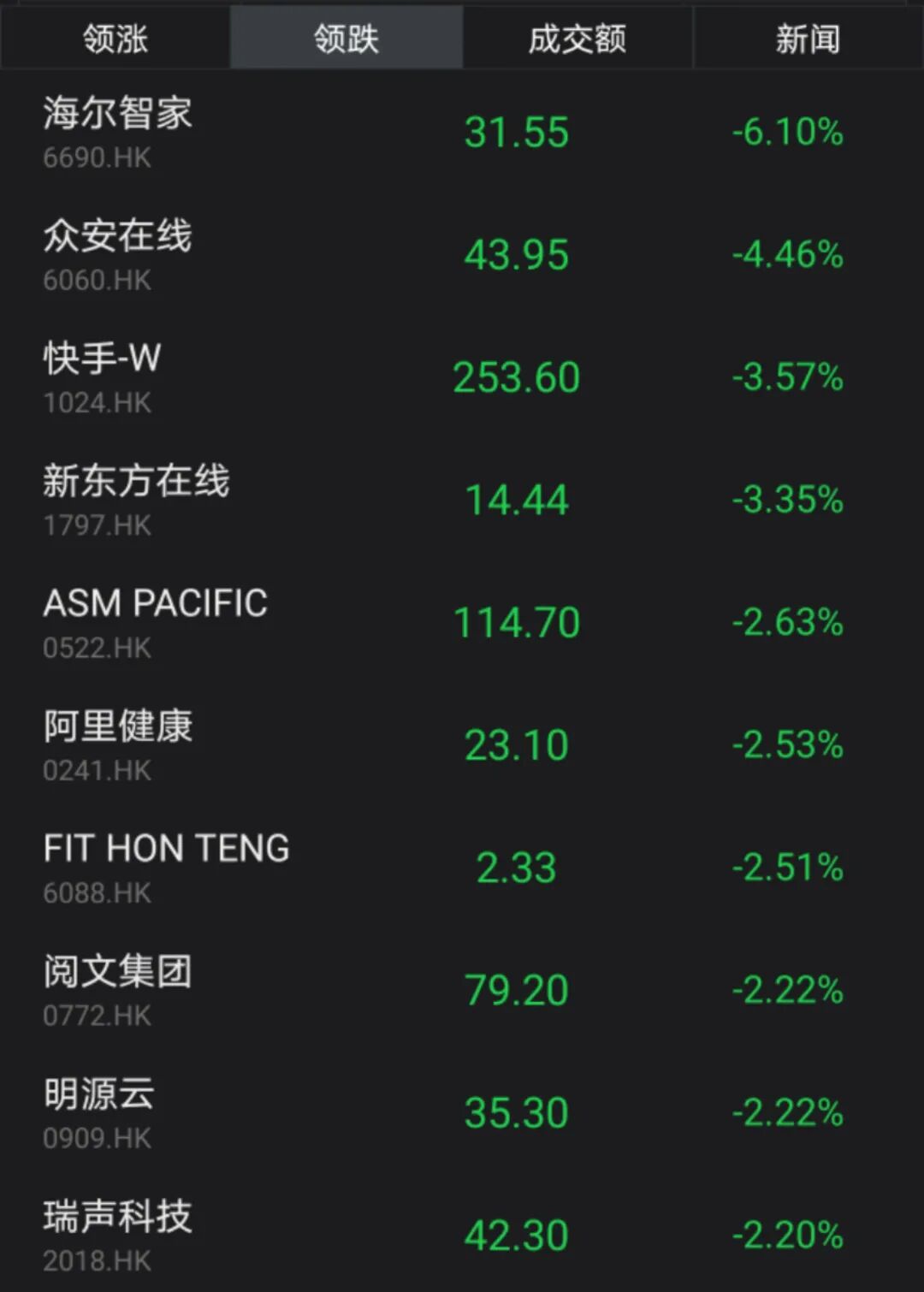 其中,恒指开盘跌0.23%,半天跌近1.5%。恒生科技指数跌幅扩大至1.31%,海尔智家以近6.1%跌幅领跌;众安在线、快手在线分别下跌4.46%、3.57%。