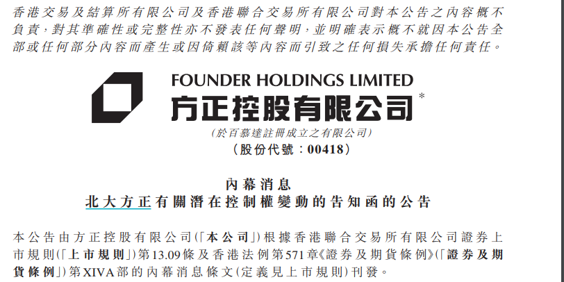 一旦重整方案生效,北大方正信息产业集团有限公司持有的该公司股权将由重整投资者直接或间接持有,可能导致该公司控股股东发生变化。
