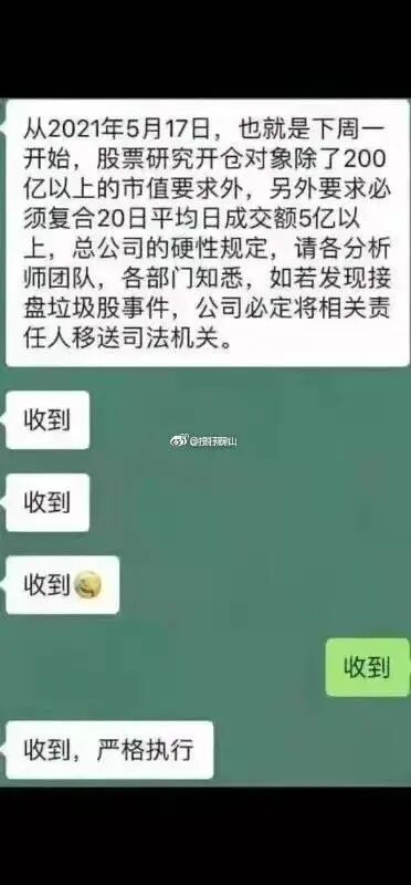 据传,有机构下发通知称:“从2021年5月17日,股票研究开仓对象除了200亿元以上的市值要求外,另外要求必须复合20日平均日成交额5亿元以上,总公司的硬性规定,请各分析师团队,各部门知悉,如若发现接盘垃圾股事件,公司必定将相关责任人移送司法机关。”