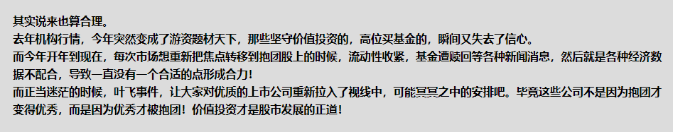 不过淘友“股的idea”则认为虽然事情发生了,但是资金回流白马绩优股也是合理的,毕竟价值投资才是股市发展的正道。