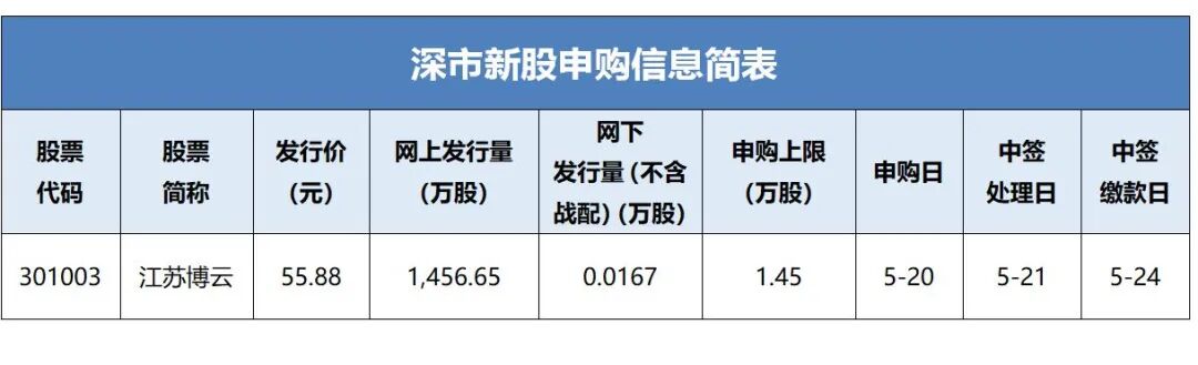 江苏博云新股申购信息最后修改: 2021-05-19 17:27:27深交所2021年5月20日,江苏博云塑业股份有限公司(简称:江苏博云)将通过深交所网下发行电子平台和交易系统发行新股,具体信息如下。