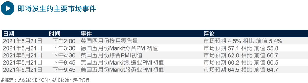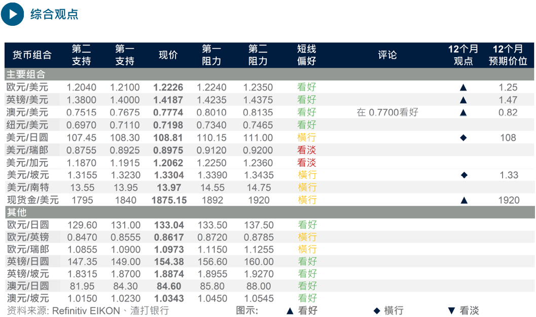 美元反弹一日之后再度下跌、美国国债收益率走低、而美国股市则走高。加密货币在极度动荡后稳定下来,尽管有传言称当局可能寻求汇报加密货币的转帐和美联储提醒加密货币对金融稳定的风险。市场对美联储收回宽松政策的恐惧似乎逐渐消退了。我们认为美元有机会进一步跌至关键的技术水平。如果欧元兑美元升破1.2240,我们预计将会快速升至1.2350。英镑兑美元接近2021年高位1.4235,若能突破应该会升至2018年高位1.4375。这些较高的价位水平可能会展现韧性,但若能持续突破则可能表明下一个阶段的美元周期性下跌趋势已经开展。