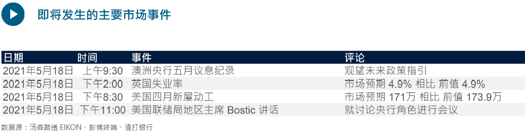 随着英国放宽封锁,隔夜英镑成为强势货币之一。英镑兑美元正接近二月份高位1.4235,若能突破将瞄准2018年高位1.4375。隔夜欧元兑美元窄幅交易,和整体美元走向一致,或许因为美国债市和股市均变化不大。只要守住位于1.1940-1.2040的支持位,我们预计欧元兑美元首先会测试1.2240,然后是近期高位1.2350。澳元和纽元整固近期兑美元的升幅;我们预期随着美元广泛转弱,两只货币均有望走高。