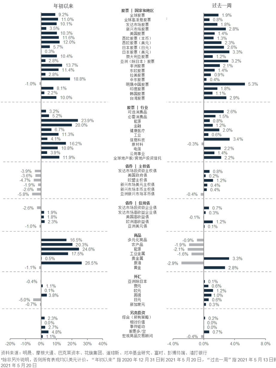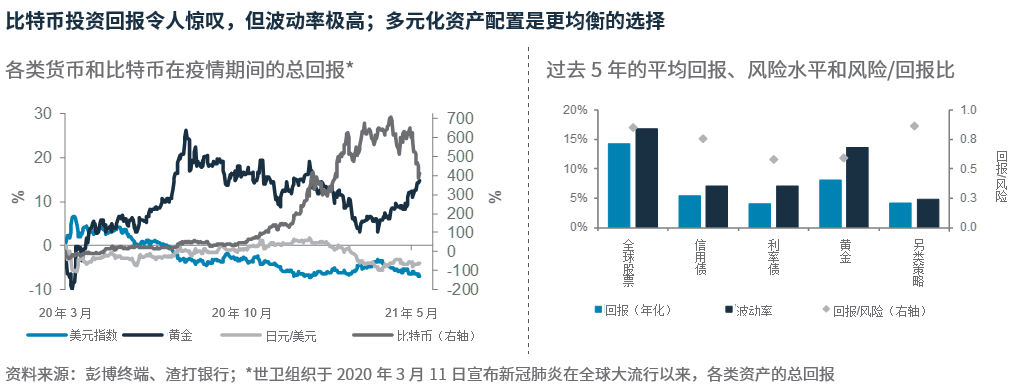 比特币价格自4月峰值下泄约35%,期间波动率极大(包括周三31%的峰谷差),向投资者传递出清晰的信息—切勿追逐近来的加密货币圈热潮,拿核心投资冒险。虽然我们预计近来比特币价格的大起大落不会波及其他资产,但是这种极端波动提醒了人们保持多元化资产配置的好处。如图所示,将资产配置广泛分散在股票、债券、黄金和其他另类资产,从中长期来看,或许可以获得更稳定的风险调整后的回报。诚然,疫情爆发以来,诸如比特币之类的资产涨势如虹,但其背后的代价是,极高的波动率,还有许多投资者可能曾经历的不眠之夜。