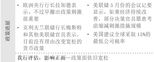 美联储最近的会议纪要显示,随着美国就业市场情况改善,政策制定者也开始讨论撤出刺激计划。该会议纪要还提升了市场参与者对于美联储在4季度前宣布逐步缩减债券购买规模的预期。诚然,未来6-12个月内美国逐步缩减量化宽松规模的可能性在增加—就业市场的进展,尤其是较低收入行业的情况—对于开始缩减量宽的时点,将起到关键作用。与此同时,经济数据和企业盈利继续改善,美国和欧洲尤其如此。