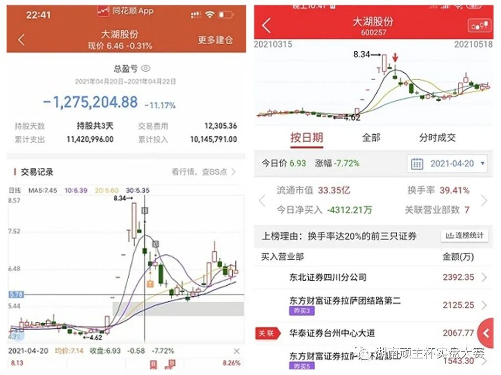 4月20日工程师重仓低吸高位杀跌的大湖股份,但是从分时层面来看却是买在了全天最高位,接近平盘买入,到收盘时大湖再度杀跌,当天即大面近百万,还上了龙虎榜的买一,第二天大湖继续杀跌,第三天才割肉走人,这笔亏了接近300万。
