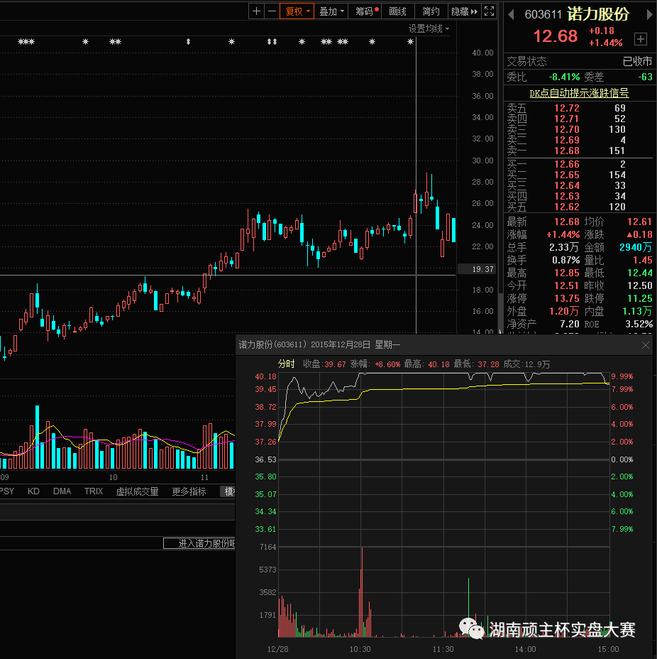 12月28号诺力股份,小盘次新股,股性一般,之所以一般,是因为前期涨停很少,但是是小盘股,当天如果封板不开,不是烂板,第二天应该有一波拉高吃肉,但是当天大盘很差跌2.58%,导致烂板,且尾盘开板,第二天不应再抱有幻想,开盘反弹有阻力立马跑掉。全天也就开盘的时候最强势,后面都是低位震荡。总结:烂板本来就是自己判断有误进去的,方法错了,立即止损,10点前有拉升必须出掉,为买今天的强势涨停做准备,避免因当天的失误,损失了第二天的利润。