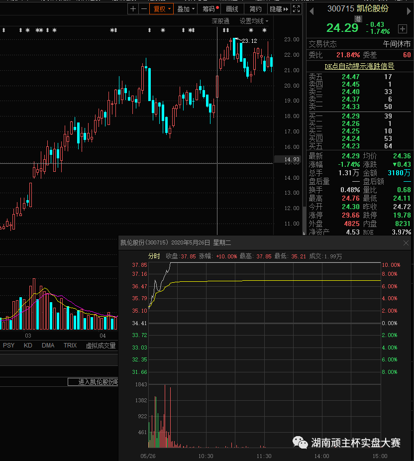 5月27日凯伦与中光学均高开高走,主人公冲高套利走人,单日帐户整体收益3.81%,当天又以小仓位打了一点商赢环球的超跌首板,这是一支前期的爆雷股,连续跌停后超跌反弹,从形态上看并没有太多吸引力,他也因此只打了极小仓位。